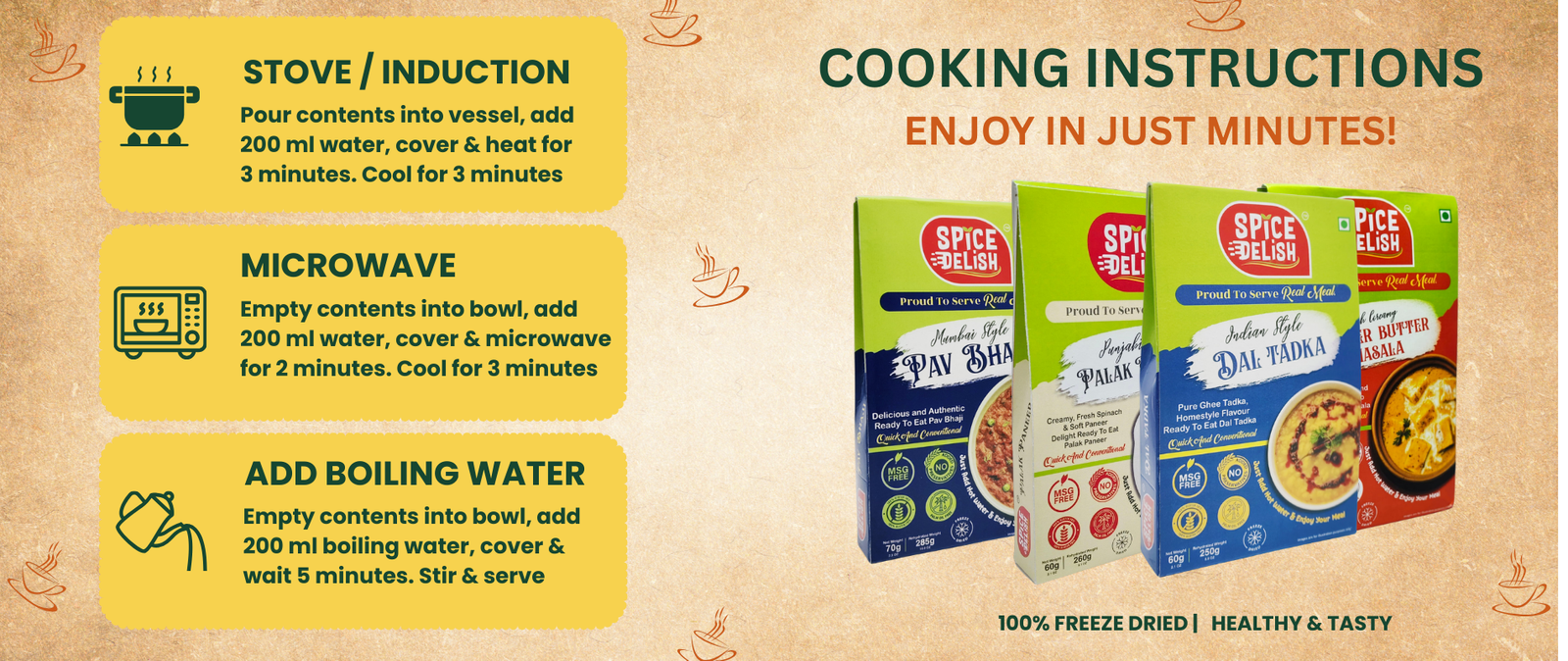 Posted on Ankita AjmeriTrustindex verifies that the original source of the review is Google. Spice Delish brings you authentic Indian flavors in easy-to-make, Ready to Eat, Freeze Dried meals — tasty, fresh, and convenient anytime, anywhere.At Spice Delish, we promise homemade taste, hygienic packaging, and quick meals that fit your busy lifestyle.Posted on Sanjay BoroleTrustindex verifies that the original source of the review is Google. Good food packetPosted on HEMANT GOHILTrustindex verifies that the original source of the review is Google. Easy to carry and easy to make . and taste was delicious like Home made.Dal Tadaka taste wonderfulPosted on Ravi PatelTrustindex verifies that the original source of the review is Google. Very yummy food ,just like mom hand Enjoyed at my tracking tour.very tasty and easy to make.Posted on Bharat RabariTrustindex verifies that the original source of the review is Google. Very nice quality and test.Posted on Rudresh TamboliTrustindex verifies that the original source of the review is Google. I tried pav bhaji, it's tast are amazing also it's making way are very easy.Posted on Kachhela NileshTrustindex verifies that the original source of the review is Google. Delicious pavbhaji. And tasty veg Buryani. We are in himachal and try this ready to cook Pack enjoy the Indian tastePosted on PARMAR BHARATKUMARTrustindex verifies that the original source of the review is Google. We try it's veg Biryani and dal tadka . Very tasty and easy to cook dishPosted on Miteshsingh RajputTrustindex verifies that the original source of the review is Google. Spice delish Dal makhani taste is very much good. I am loving it. ❤️Posted on Ajay VichareTrustindex verifies that the original source of the review is Google. Very tasty and delicious product